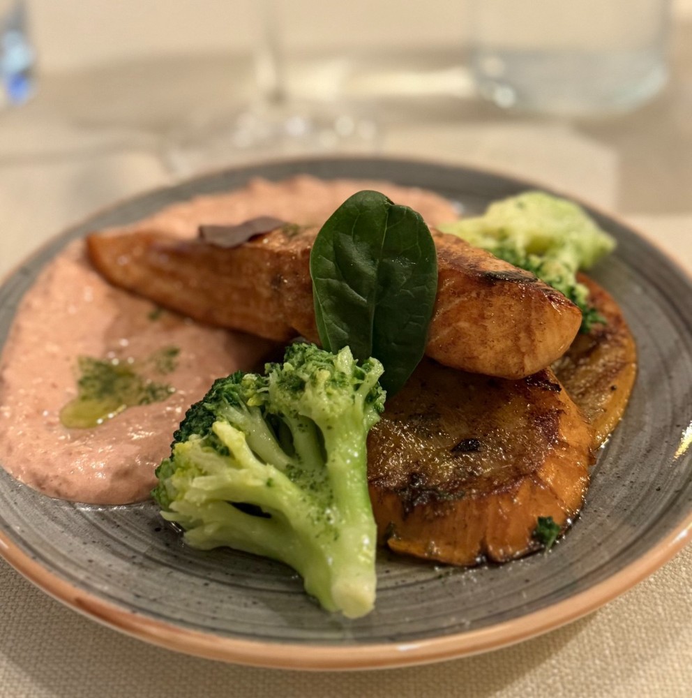 Стейк форелі із запеченою хурмою та броколі під крем соусом із в'ялених томатів, 425г